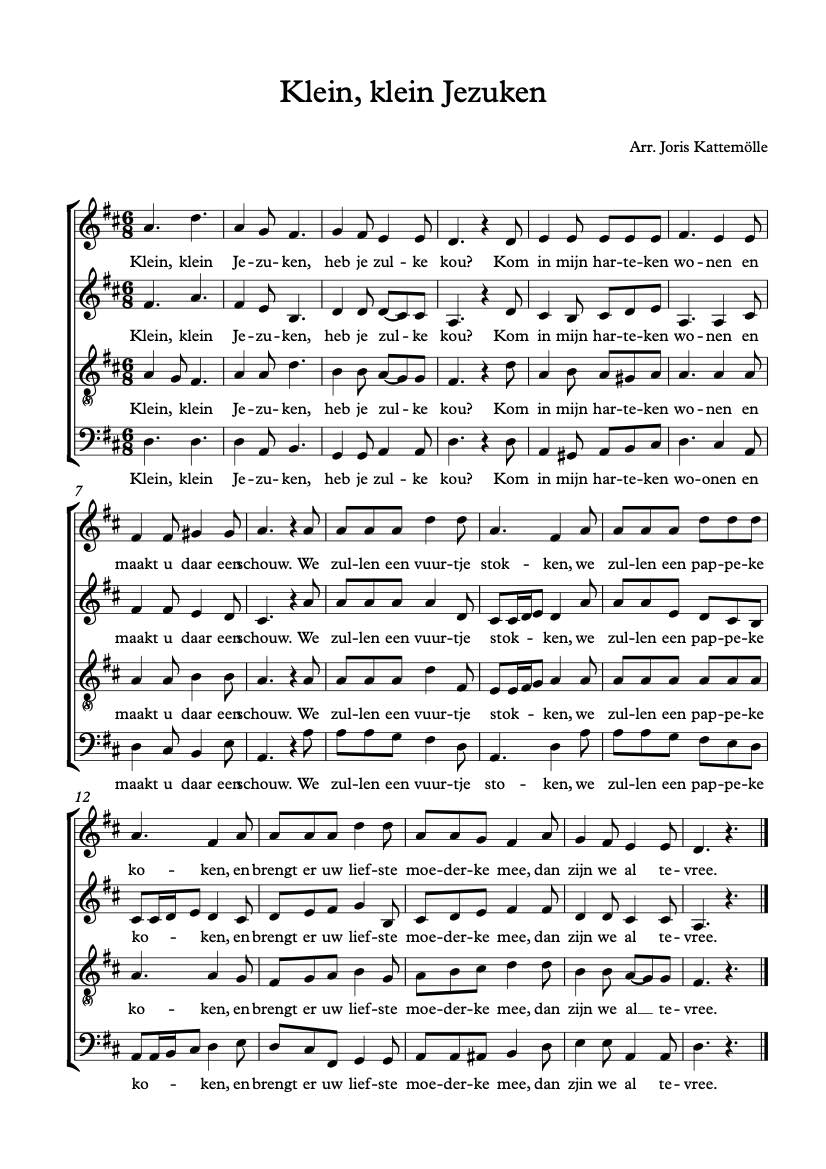 Deze pagina bevat bladmuziek en geluidsbestanden van mijn arrangement van van het kerstlied 'Klein, klein Jezuken', voor koor SATB.